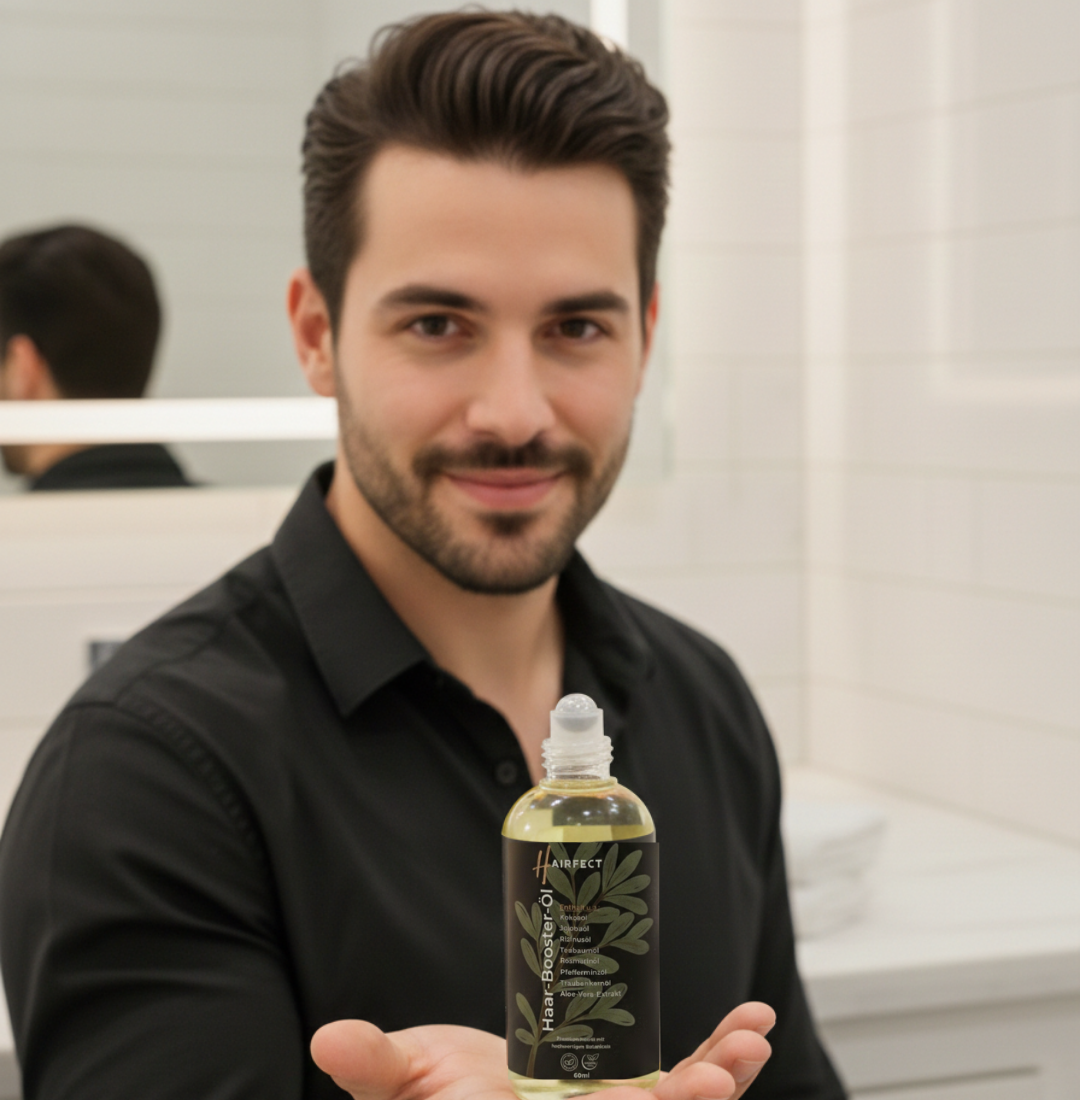 Ja, Rosmarinöl+ enthält eine wertvolle Mischung aus ätherischen Ölen und natürlichen Inhaltsstoffen, die die Haarstruktur stärken und das Haarwachstum fördern können. Bei regelmäßiger Anwendung kann bereits nach 6 Monaten eine spürbare Verbesserung der Haardichte auftreten.