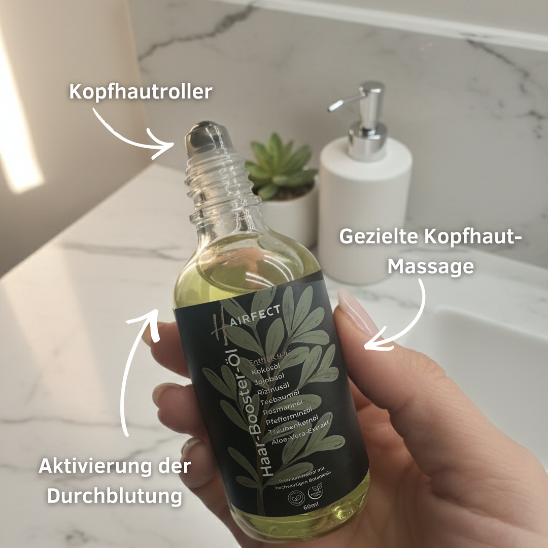 Haar-Booster-Öl beruhigt die Kopfhaut, fördert die Durchblutung und verleiht ein erfrischendes Gefühl. Die belebende Wirkung sorgt für spürbare Frische und ein angenehmes Wohlgefühl.